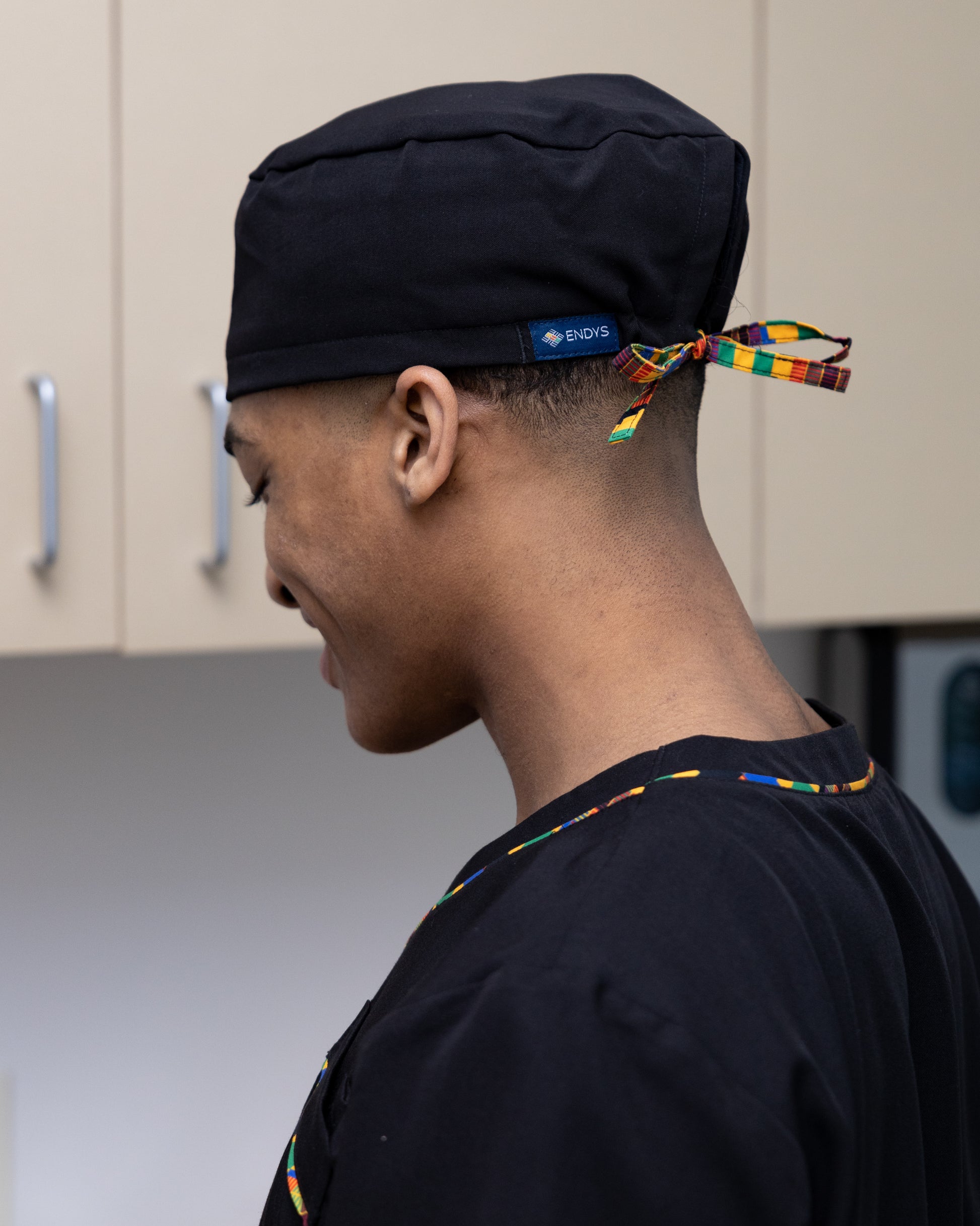 This premium black scrub cap features adjustable ties in our signature Heritage Pop printβ€”a vibrant mosaic of gold, emerald, sapphire, and warm spice tones arranged in crisp, rhythmic geometry. The perfect balance of professional polish and personal style.