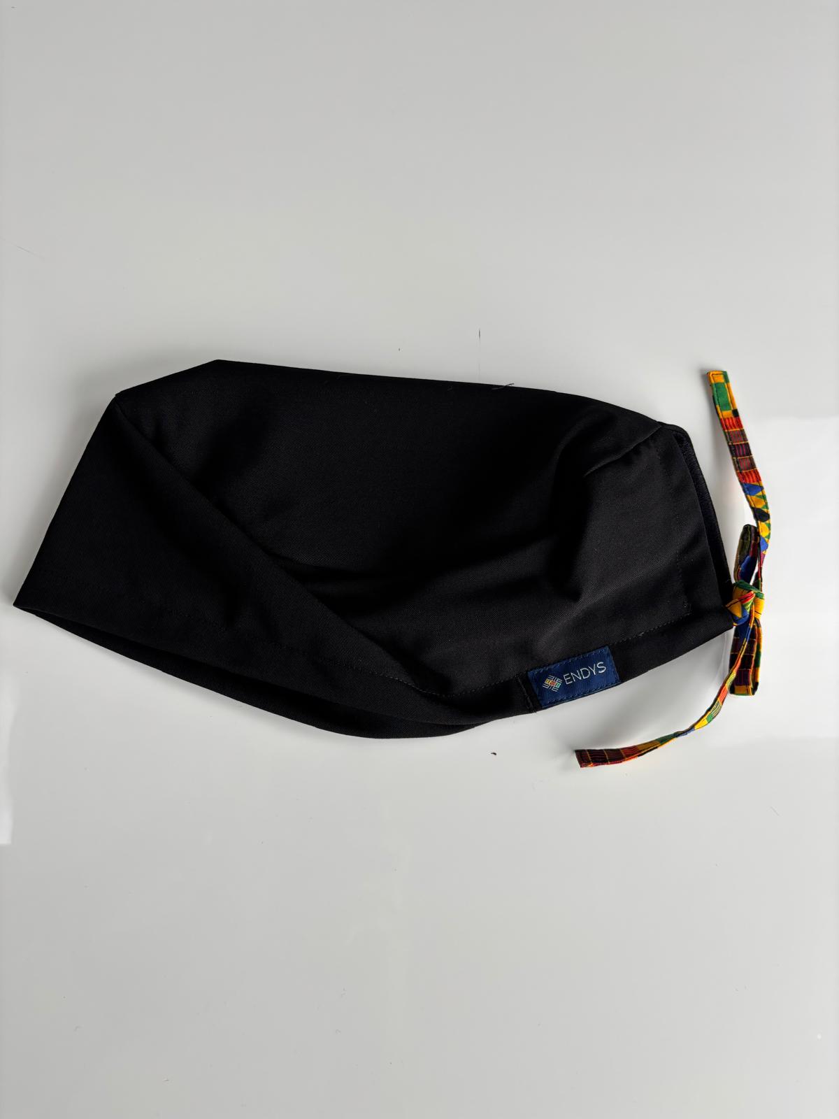 [Satin-lined + Sweatband] Black Unisex Scrub Cap with Kente Ties